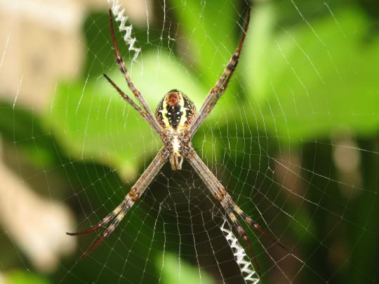 Pola jaring ekstra ini bisa ditemukan diantara sejumlah spesies laba-laba – tapi contoh terbaiknya adalah yang dari jenis Argiope. Pola ekstra ini, seringkali hampir presisi secara matematis dengan sudut 45 derajat, sepertinya dibuat untuk “memelarkan” tubuh mereka sehingga membuatnya lebih tidak menarik predatornya. Kadang-kadang pola ini mengarah vertikal dan laba-laba yang lebih muda mungkin membuatnya berbentuk seperti piringan.